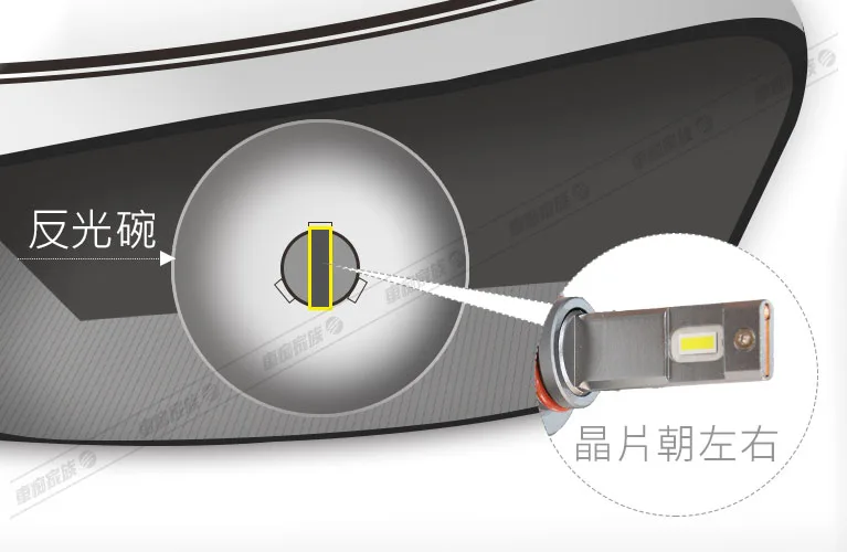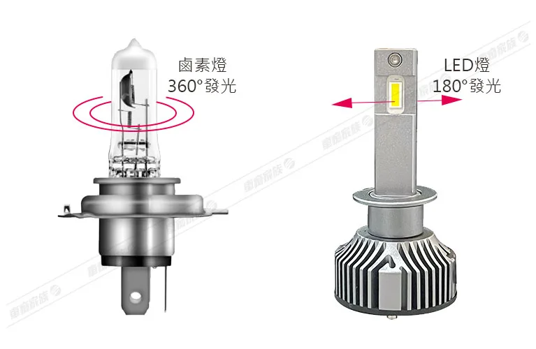 不同於鹵素燈的360度發光,LED是「單面發光」,在安裝汽車LED燈泡產品時,需注意LED發光方向(晶片)是否朝「左右」兩側,而不是「上下」的方向。